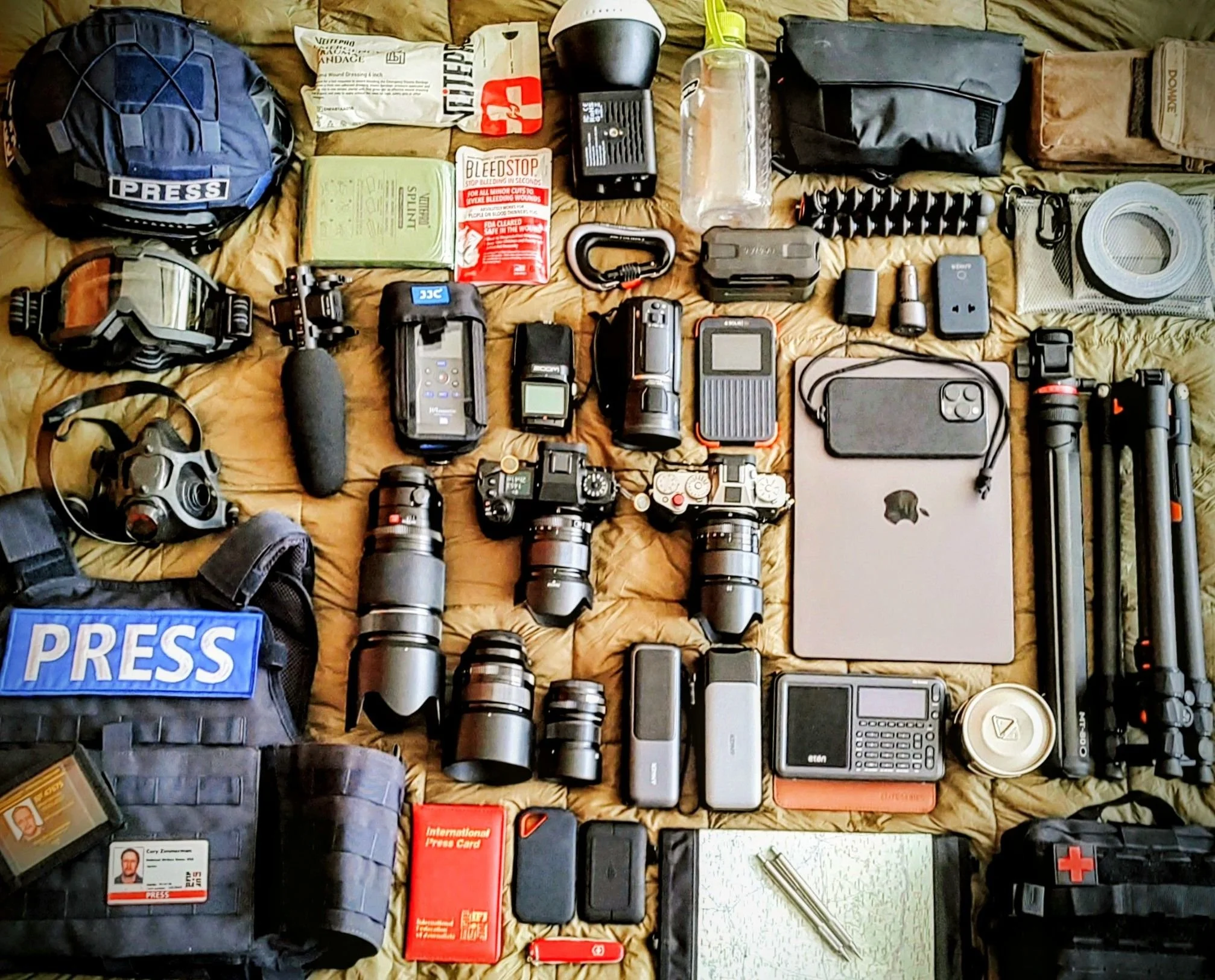 Layer 3 - Osprey 20L Boarder Bag / Domke PhotoTog Vest & Carhartt Field Jacket: Tactical documentation (passport, IFJ card, Ministry of Defence Yellow Pass, assignment letter, war zone insurance), international hotspot, 2 cellphones, RAID data management (2 SSD, 1 HHD), laptop, battery packs, chargers, pens/pads, and immediate-response gear.